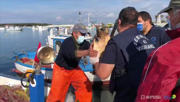 Grazie all’impegno profuso negli anni dal Consorzio di Gestione di Porto Cesareo sul fronte della sensibilizzazione della vasta marineria del posto sul tema della tutela della fauna marina, oggi i pescatori che rinvengono una tartaruga catturata accidentalmente, contattano l’AMP e gli operatori cesarini rispondono, recuperando l’esemplare.