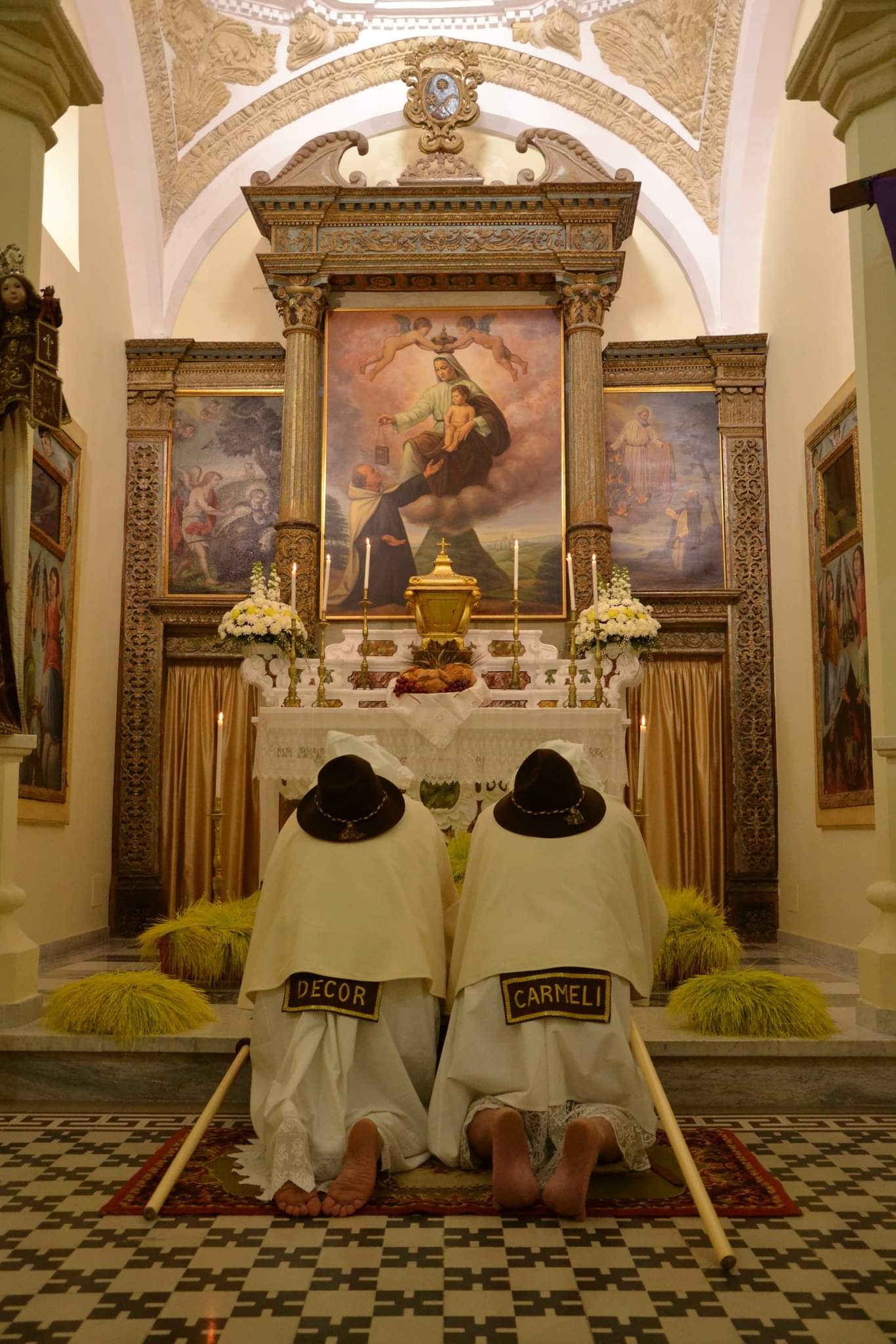 Dal 1756 il lungo pellegrinaggio dei perdoni scalzi (“Li BBubbli BBubbli” in dialetto grottagliese, coppie di Confratelli del Carmine) accompagna i tanti devoti agli altari della reposizione, popolarmente detti “Sepolcri”, allestiti in ogni chiesa il pomeriggio del Giovedì Santo. Nella Chiesa Madonna S.S. del Rosario, situata fuori dal percorso dei perdoni, è la Confraternita del Rosario ad occuparsi dell’allestimento e adorazione all’altare della reposizione.