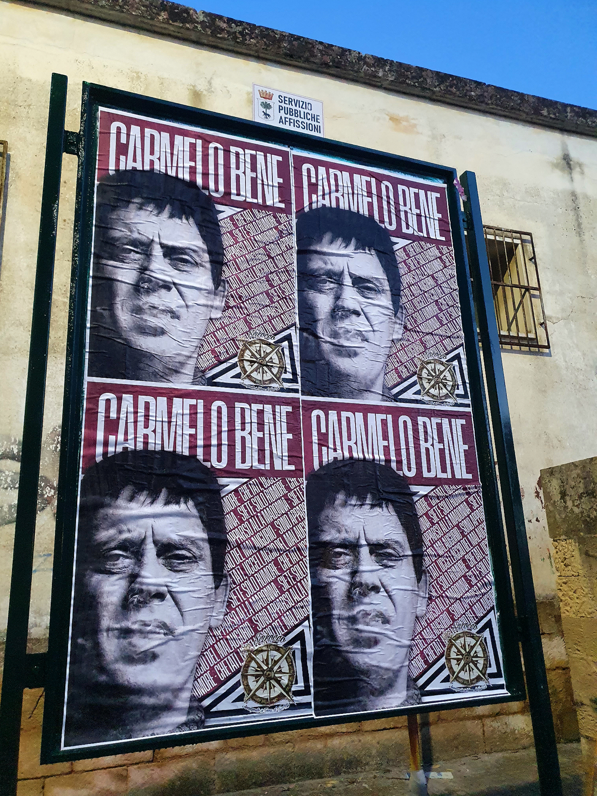“Sono apparso alla Madonna – Chetati, uccellaccio del malaugurio – Siete solo rumore”, tre frasi iconiche come sfondo a un ritratto in primo piano, impressi su decine di manifesti e una gigantografia, con i quali l’Associazione culturale Scirocco ha inteso ricordare Carmelo Bene.
