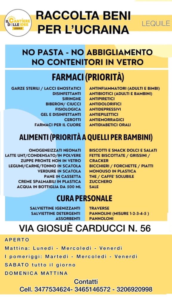 “Siamo certi! – continua Nicolini – Partirà anche dalla NOSTRA LEQUILE un pullman carico di speranza. Portiamo in Ucraina il NOSTRO cuore, la NOSTRA vicinanza, la speranza di un mondo migliore. Oggi serve l’impegno e la presenza di tutta la Comunità”.